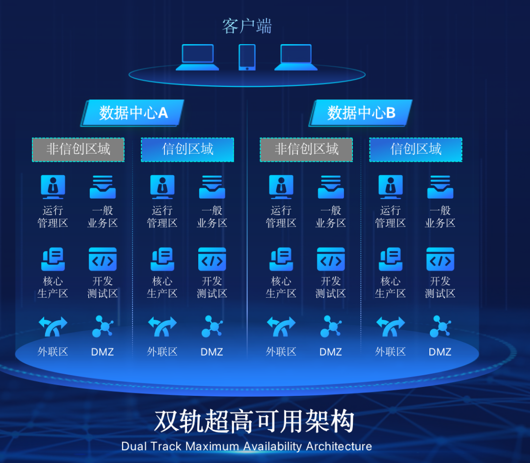 九游NineGame在企业面临自主创新IT基础重构过程中,推出的全新架构双轨超高可用架构(简称DTMAA),在双活数据中心的分区调度基础上,添加每个数据中心内信创域和非信创域的分域调度,来实现分区分域协同的多活双轨超高可用。